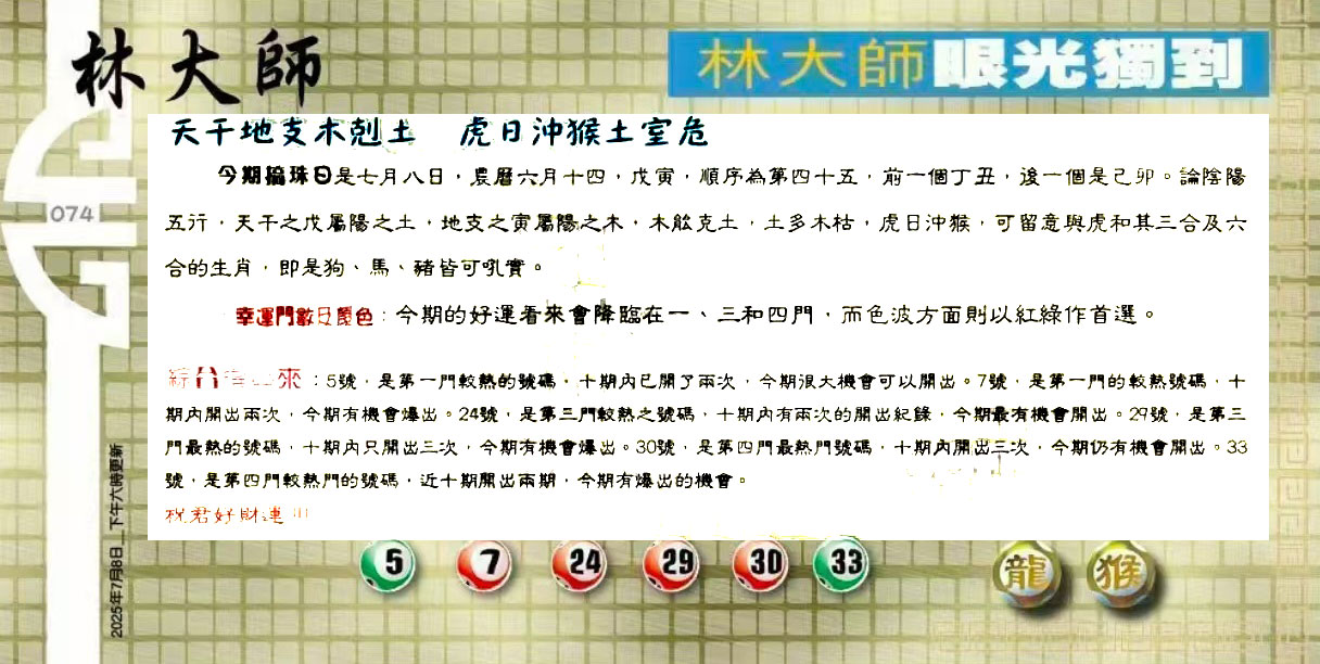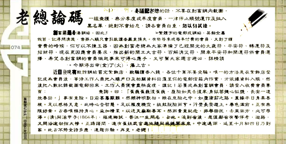 074期:六合皇金句/老总论码/萧公子/林大师/五行夺码/老总信箱截