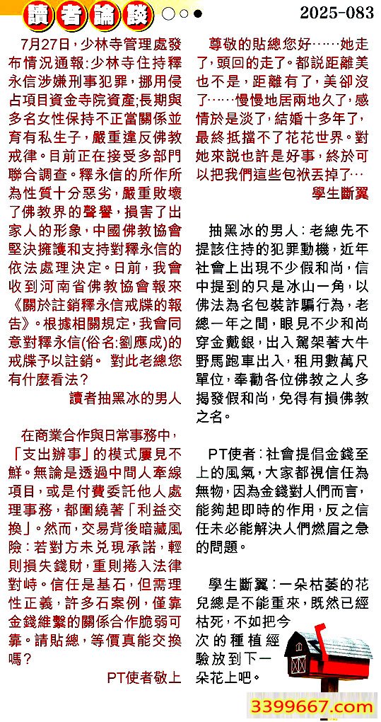 1.7月27日,少林寺管理處發布情況通報:少林寺住持釋永信涉嫌刑事犯罪,挪用侵占項目資金寺院資產;長期與多名女性保持不正當關係並育有私生子,嚴重違反佛教戒律。目前正在接受多部門聯合調查。釋永信的所作所為性質十分惡劣,嚴重敗壞了佛教界的聲譽,損害了出家人的形象,中國佛教協會堅決擁護和支持對釋永信的依法處理決定。日前,我會收到河南省佛教協會報來《關於註銷釋永信戒牒的報告》。根據相關規定,我會同意對釋永信(俗名:劉應成)的戒牒予以註銷。對此老總您有什麼看法?====讀者抽黑冰的男人