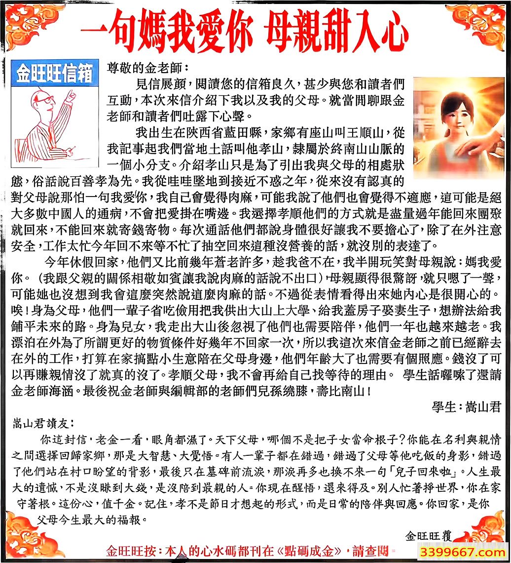 100期:金旺旺信箱彩民推荐→→《一句媽我愛你 母親甜入心》