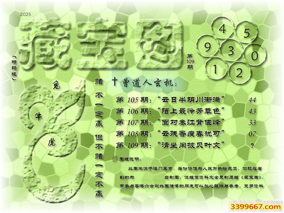 109期藏寶圖 新:清坐闲披贝叶文 老:寻到溪源壹线初 禁:龙 禁:6尾
