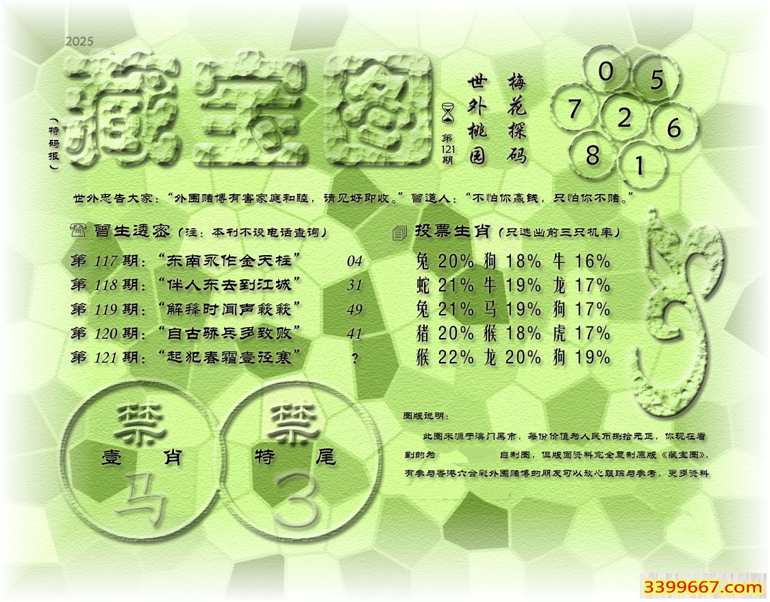 121期藏寶圖 新:未知太保李公谁 老:起犯春霜壹泾寒 禁:马 禁:3尾